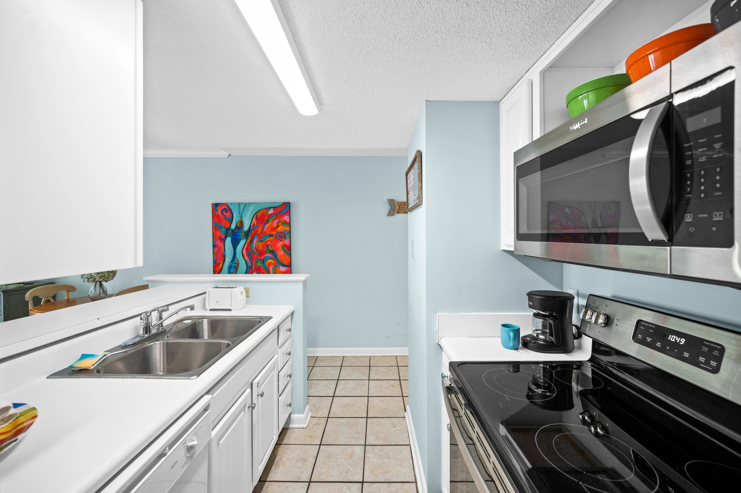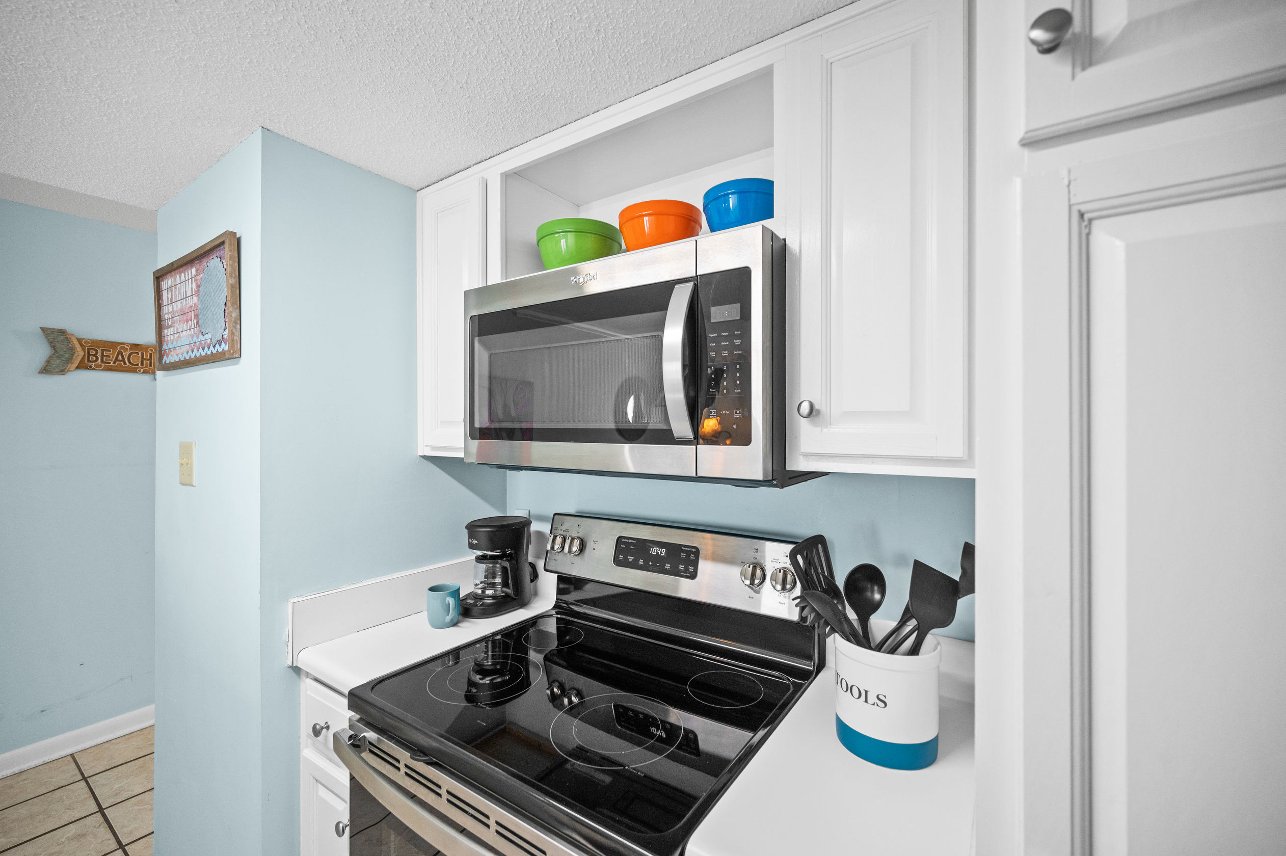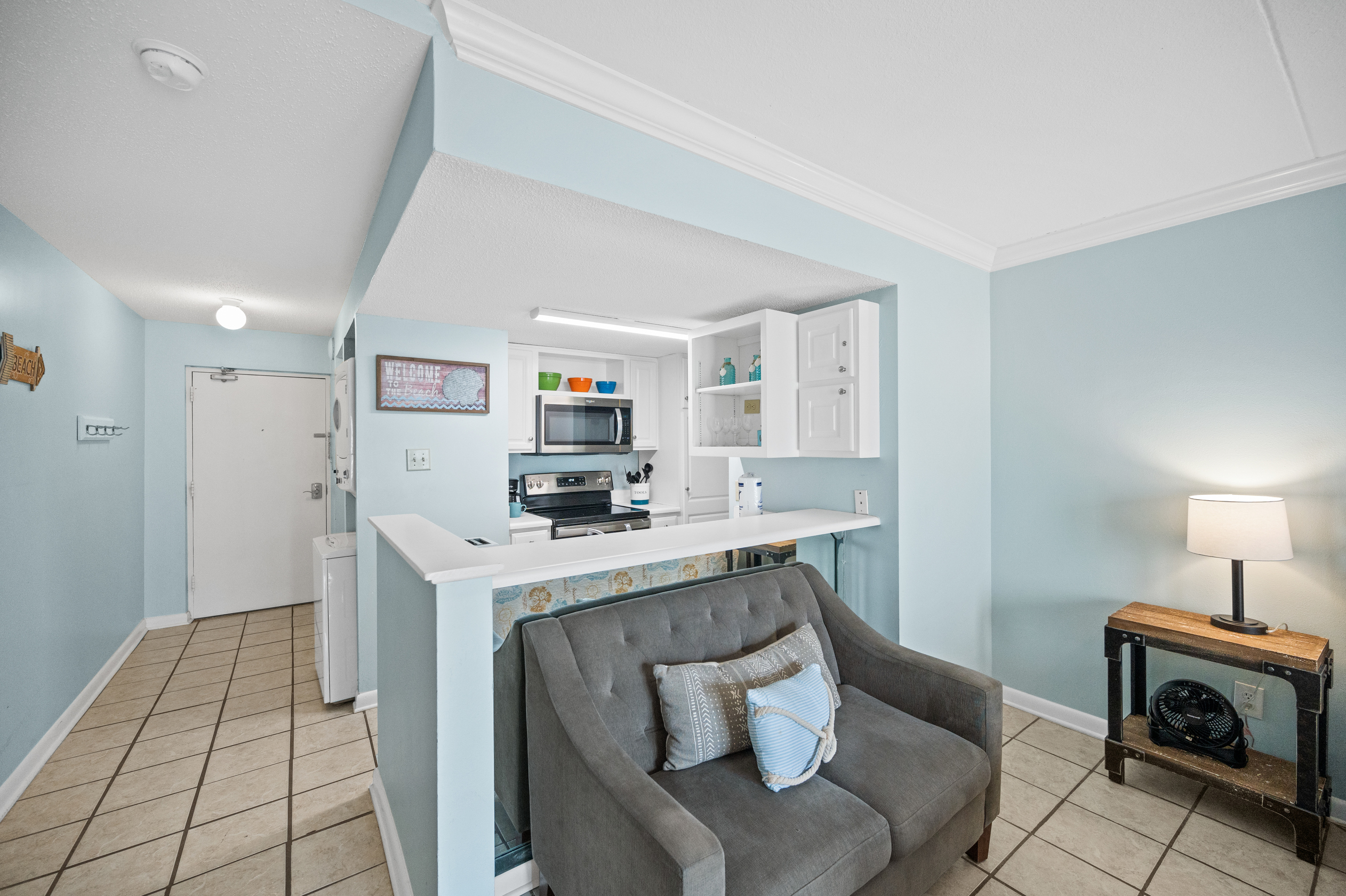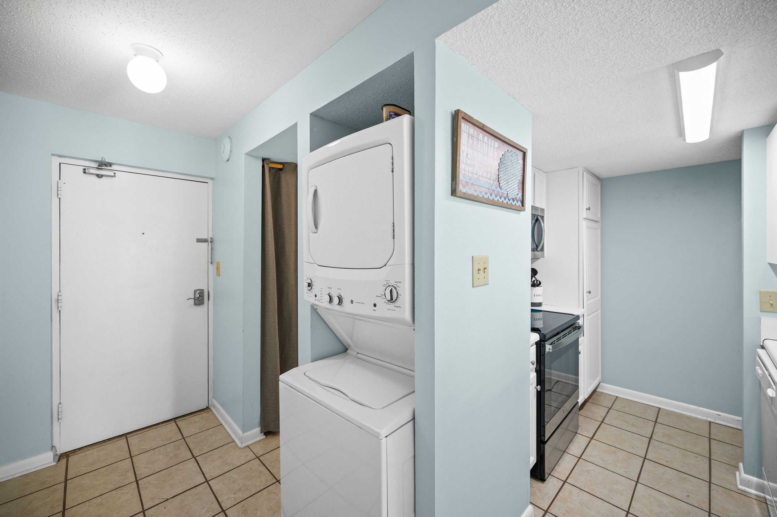 The fully equipped kitchen has everything you need to prepare delicious meals during your stay. Whether it's a quick breakfast, lunch or dinner after a day at the beach, this kitchen has all the essentials. Additionally, the condo features a full-sized washer and dryer, allowing you to conveniently keep your beachwear clean and fresh throughout your vacation.