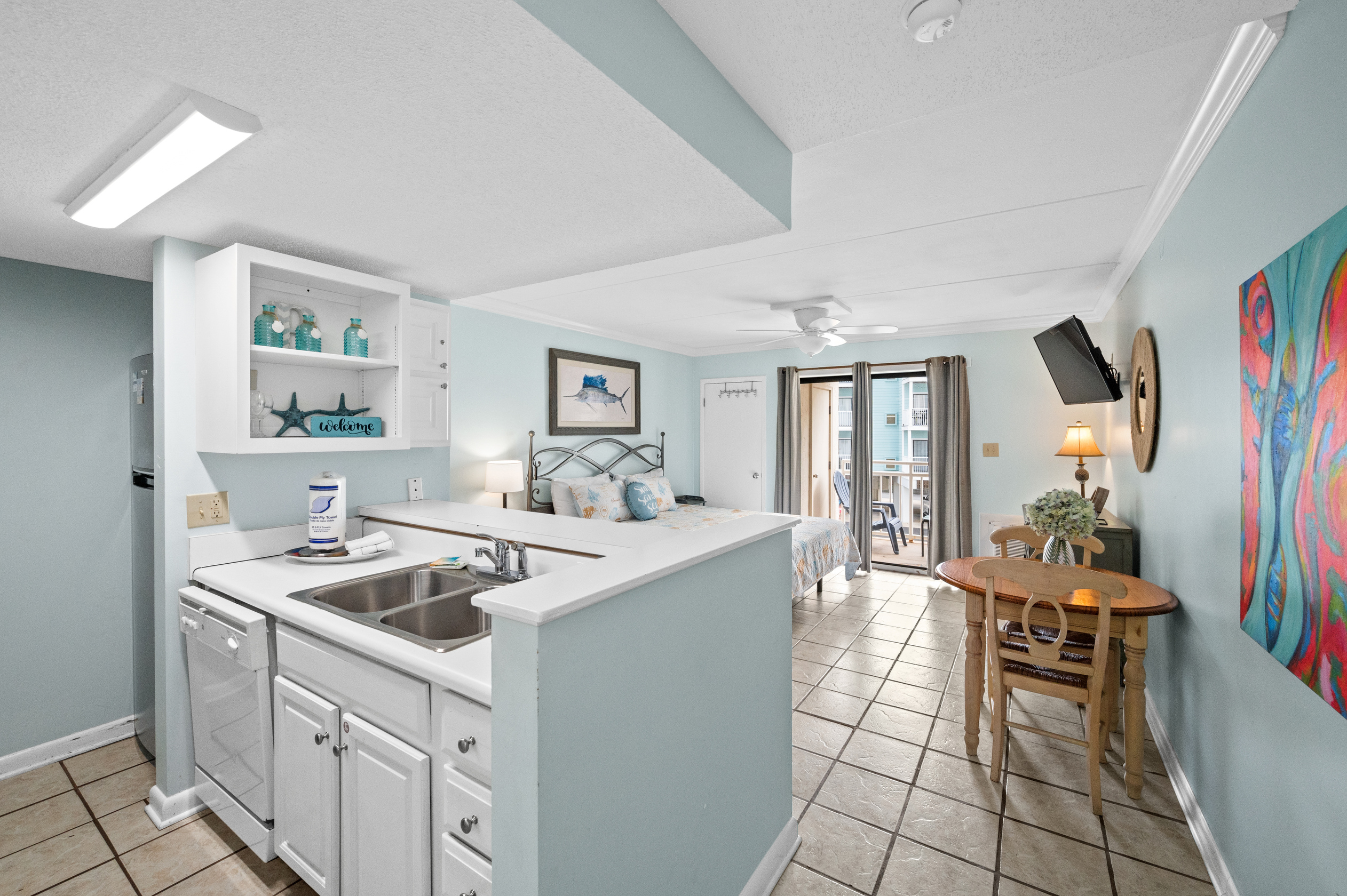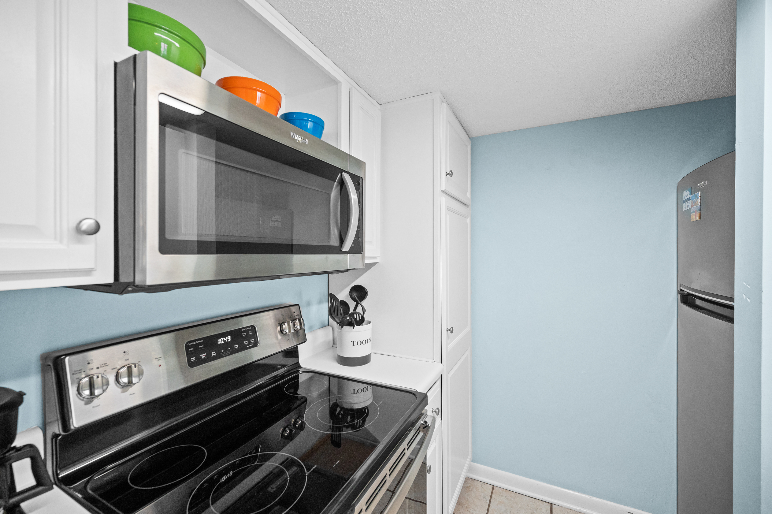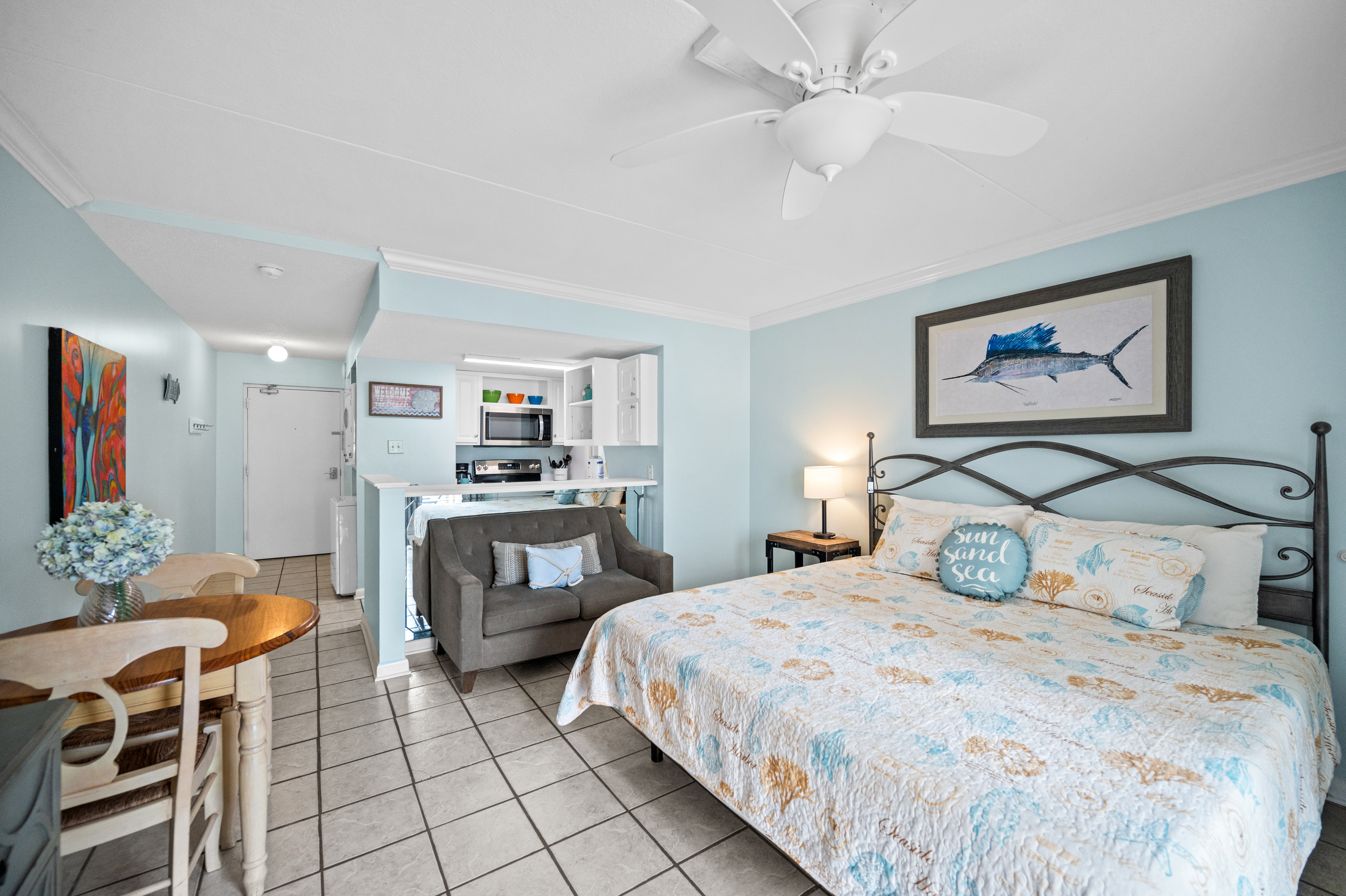 The fully equipped kitchen has everything you need to prepare delicious meals during your stay. Whether it's a quick breakfast, lunch or dinner after a day at the beach, this kitchen has all the essentials. Additionally, the condo features a full-sized washer and dryer, allowing you to conveniently keep your beachwear clean and fresh throughout your vacation.