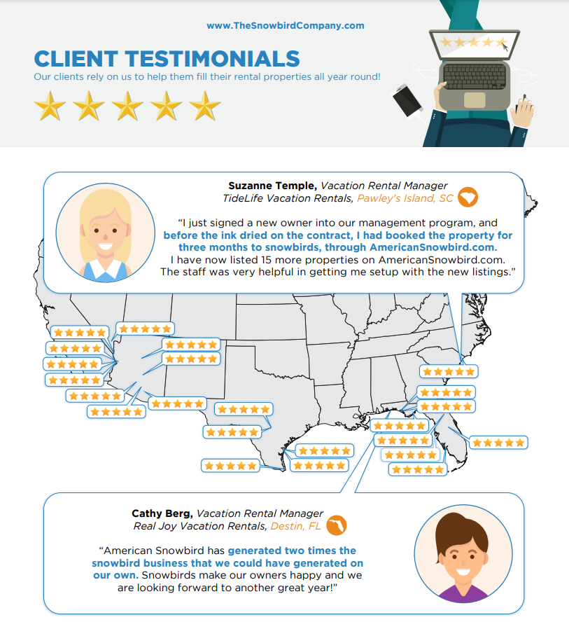 For more information on becoming a member of the Snowbird Rentals Network of Rent-by-Owner websites, visit us online or call 800-270-2457